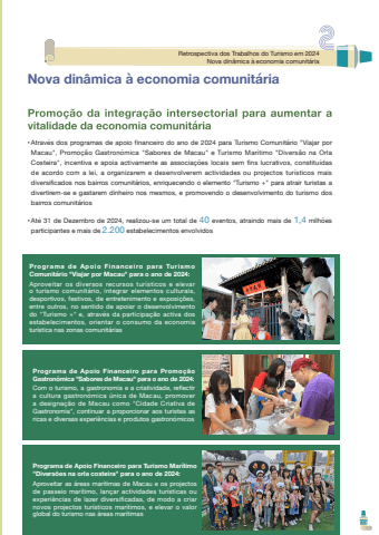 Nova din%u00e2mica %u00e0 economia comunit%u00e1riaPromo%u00e7%u00e3o da integra%u00e7%u00e3o intersectorial para aumentar a vitalidade da economia comunit%u00e1ria%u2022 Atrav%u00e9s dos programas de apoio financeiro do ano de 2024 para Turismo Comunit%u00e1rio \Macau\Costeira\de acordo com a lei, a organizarem e desenvolverem actividades ou projectos tur%u00edsticos mais diversificados nos bairros comunit%u00e1rios, enriquecendo o elemento \divertirem-se e gastarem dinheiro nos mesmos, e promovendo o desenvolvimento do turismo dos bairros comunit%u00e1rios%u2022 At%u00e9 31 de Dezembro de 2024, realizou-se um total de 40 eventos, atraindo mais de 1,4 milh%u00f5es participantes e mais de 2.200 estabelecimentos envolvidosPrograma de Apoio Financeiro para Turismo Comunit%u00e1rio \Aproveitar os diversos recursos tur%u00edsticos e elevar o turismo comunit%u00e1rio, integrar elementos culturais, desportivos, festivos, de entretenimento e exposi%u00e7%u00f5es, entre outros, no sentido de apoiar o desenvolvimento do \estabelecimentos, orientar o consumo da economia tur%u00edstica nas zonas comunit%u00e1riasPrograma de Apoio Financeiro para Promo%u00e7%u00e3o Gastron%u00f3mica \Com o turismo, a gastronomia e a criatividade, reflectir a cultura gastron%u00f3mica %u00fanica de Macau, promover a designa%u00e7%u00e3o de Macau como \Gastronomia\ricas e diversas experi%u00eancias e produtos gastron%u00f3micos Programa de Apoio Financeiro para Turismo Mar%u00edtimo \ na orla costeira\Aproveitar as %u00e1reas mar%u00edtimas de Macau e os projectos de passeio mar%u00edtimo, lan%u00e7ar actividades tur%u00edsticas ou experi%u00eancias de lazer diversificadas, de modo a criar novos projectos tur%u00edsticos mar%u00edtimos, e elevar o valor global do turismo nas %u00e1reas mar%u00edtimasRetrospectiva dos Trabalhos do Turismo em 2024%u2022 Nova din%u00e2mica %u00e0 economia comunit%u00e1ria115