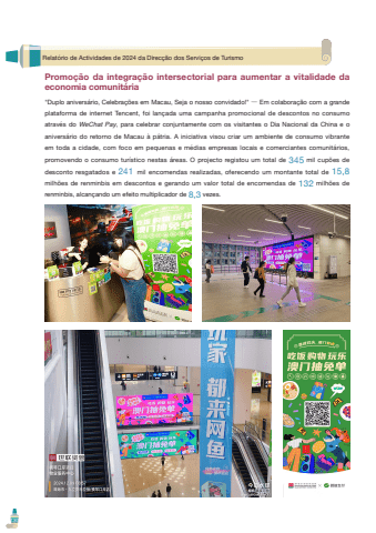 Promo%u00e7%u00e3o da integra%u00e7%u00e3o intersectorial para aumentar a vitalidade da economia comunit%u00e1ria\ anivers%u00e1rio, Celebra%u00e7%u00f5es em Macau, Seja o nosso convidado!\plataforma de internet Tencent, foi lan%u00e7ada uma campanha promocional de descontos no consumo atrav%u00e9s do WeChat Pay, para celebrar conjuntamente com os visitantes o Dia Nacional da China e o anivers%u00e1rio do retorno de Macau %u00e0 p%u00e1tria. A iniciativa visou criar um ambiente de consumo vibrante em toda a cidade, com foco em pequenas e m%u00e9dias empresas locais e comerciantes comunit%u00e1rios, promovendo o consumo tur%u00edstico nestas %u00e1reas. O projecto registou um total de 345 mil cup%u00f5es de desconto resgatados e 241 mil encomendas realizadas, oferecendo um montante total de 15,8milh%u00f5es de renminbis em descontos e gerando um valor total de encomendas de 132 milh%u00f5es de renminbis, alcan%u00e7ando um efeito multiplicador de 8,3 vezes.Relat%u00f3rio de Actividades de 2024 da Direc%u00e7%u00e3o dos Servi%u00e7os de Turismo130