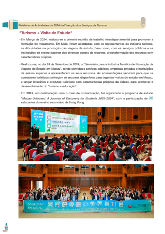 \ + Visita de Estudo\%u2022 Em Mar%u00e7o de 2024, realizou-se a primeira reuni%u00e3o de trabalho interdepartamental para promover a forma%u00e7%u00e3o do mecanismo. Em Maio, foram abordadas, com os representantes da ind%u00fastria tur%u00edstica, as dificuldades na promo%u00e7%u00e3o das viagens de estudo, bem como, com os servi%u00e7os p%u00fablicos e as institui%u00e7%u00f5es de ensino superior dos diversos pontos de recursos, a transforma%u00e7%u00e3o dos recursos com caracter%u00edsticas pr%u00f3prias%u2022 Realizou-se, no dia 24 de Setembro de 2024, o \Viagens de Estudo em Macau\de ensino superior a apresentarem os seus recursos. As apresenta%u00e7%u00f5es serviram para que os operadores tur%u00edsticos conhe%u00e7am os recursos dispon%u00edveis para organizar visitas de estudo em Macau, e lan%u00e7ar itiner%u00e1rios e produtos tur%u00edsticos com caracter%u00edsticas pr%u00f3prias da cidade, para promover o desenvolvimento do \%u2022 Em 2024, em colabora%u00e7%u00e3o com o meio de comunica%u00e7%u00e3o, foi organizado o programa de estudo \ Unlocked: A Journey of Discovery for Students 2023-2024\ com a participa%u00e7%u00e3o de 90 estudantes do ensino secund%u00e1rio de Hong KongRelat%u00f3rio de Actividades de 2024 da Direc%u00e7%u00e3o dos Servi%u00e7os de Turismo136