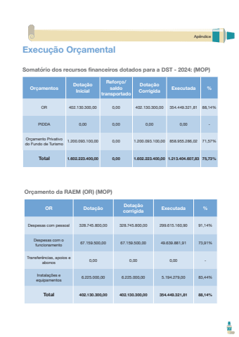 Execu%u00e7%u00e3o Or%u00e7amentalSomat%u00f3rio dos recursos financeiros dotados para a DST - 2024: (MOP)Or%u00e7amentosDota%u00e7%u00e3o InicialRefor%u00e7o/saldo transportadoDota%u00e7%u00e3o CorrigidaExecutada%OR402.130.300,000,00402.130.300,00354.449.321,8188,14%PIDDA0,000,000,000,00Or%u00e7amento Privativo do Fundo de Turismo1.200.093.100,000,001.200.093.100,00858.955.286,0271,57%Total1.602.223.400,000,001.602.223.400,001.213.404.607,8375,73%Or%u00e7amento da RAEM (OR) (MOP)ORDota%u00e7%u00e3oDota%u00e7%u00e3o corrigidaExecutada%Despesas com pessoal328.745.800,00328.745.800,00299.615.160,9091,14%Despesas com o funcionamento67.159.500,0067.159.500,0049.639.881,9173,91%Transfer%u00eancias, apoios e abonos0,000,000,00-Instala%u00e7%u00f5es e equipamentos6.225.000,006.225.000,005.194.279,0083,44%Total402.130.300,00402.130.300,00354.449.321,8188,14%Ap%u00eandice 171