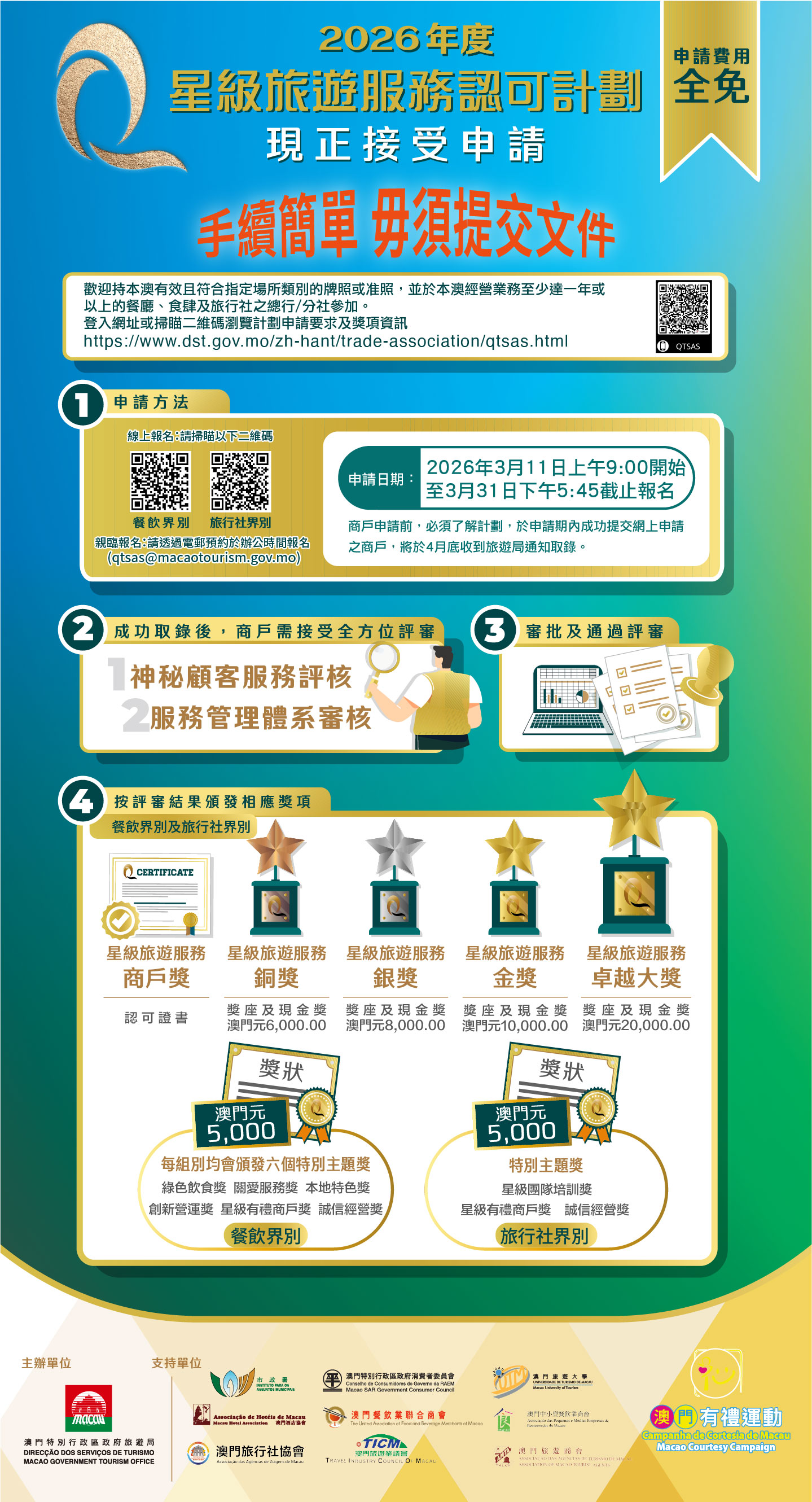 网上报名︰https://ep.macaotourism.gov.mo/qtsas-application/?lang=zh-hant§or=fnb